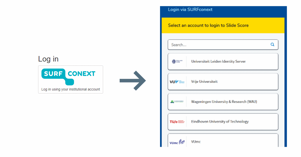 As mentioned, this currently uses SURFconext by SURF - an organization that helps researchers in the Netherlands with computer infrastructure - so it is mostly Dutch universities and hospitals that are supported. Additionally, each institution has to agree to share their users' identities with each Slide Score Server. So, if you don't see your institution on the list but you have used SURFconext with it, get in touch and we will try to include it.